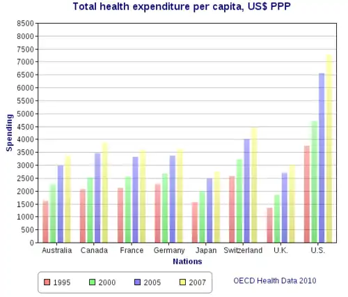- ^ a b OECD Data. Health resources - Health spending. doi:10.1787/8643de7e-en. 2 bar charts: For both: From bottom menus: Countries menu > choose OECD. Check box for "latest data available". Perspectives menu > Check box to "compare variables". Then check the boxes for government/compulsory, voluntary, and total. Click top tab for chart (bar chart). For GDP chart choose "% of GDP" from bottom menu. For per capita chart choose "US dollars/per capita". Click fullscreen button above chart. Click "print screen" key. Click top tab for table, to see data.