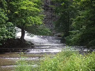 In freshwater ecology, upland rivers and streams are the fast-flowing rivers and streams that drain elevated or mountainous country, often onto broad alluvial plains (where they become lowland rivers). However, elevation is not the sole determinant of whether a river is upland or lowland. Arguably the most important determinants are those of stream power and stream gradient. Rivers with a course that drops rapidly in elevation will have faster water flow and higher stream power or "force of water". This in turn produces the other characteristics of an upland river—an incised course, a river bed dominated by bedrock and coarse sediments, a riffle and pool structure and cooler water temperatures. Rivers with a course that drops in elevation very slowly will have slower water flow and lower force. This in turn produces the other characteristics of a lowland river—a meandering course lacking rapids, a river bed dominated by fine sediments and higher water temperatures. Lowland rivers tend to carry more suspended sediment and organic matter as well, but some lowland rivers have periods of high water clarity in seasonal low-flow periods.[5]