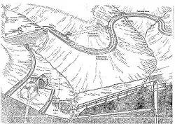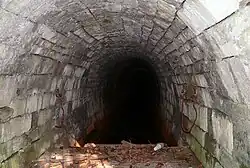 One example of the expansion of the Water Regale network was the optimisation of several ditch courses (the Dam Ditch, Upper and Lower Rosenhof Chutes), mainly during the 19th century, by the construction of so-called Wasserläufen (also Wasserüberleitungsstollen) or water tunnels. These enabled the distance travelled by the water to be significantly shortened.[5] It also guaranteed winter working, because the water running underground did not freeze up. In addition the maintenance cost of a short section of tunnel was much cheaper than that of a long ditch run. But a particularly important advantage was the higher discharge capacity. The tunnels descended the same height difference over a shorter distance and therefore had a steeper incline.[13] Initially the underground sections were laboriously hewn out with hammer and chisel. Later gunpowder was used as an explosive, making the construction of water tunnels considerably easier and faster.