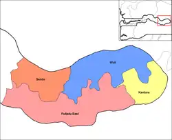Upper River is divided into 4 districts, namely, Fulladu East, Kantora, Sandu and Wuli. The city and area council elections were held during April 2002, when Kanimang Sanneh, an APRC candidate became the Mayor, winning 64.2 per cent votes. The council was led by Alliance for Patriotic Reorientation and Construction (APRC), which won all fourteen seats.[9]