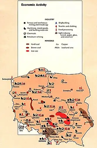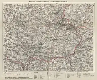 Economic activity in Poland in 1990. The Upper Silesian Coal Basin is visible in brown, in the southern part of the country.Map of the Upper Silesian Coal Basin published in 1910.