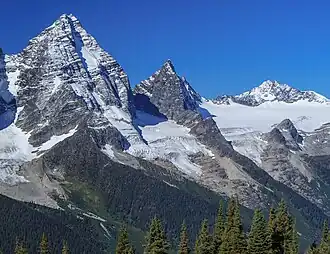 ![]() Uto Peak centered between Mount Sir Donald (left), and Avalanche Mountain (right) | |