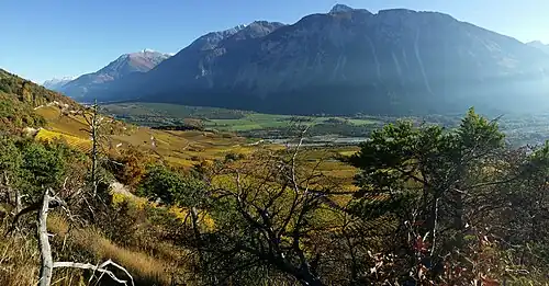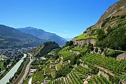 Due to the high mountains surrounding the plains of the Rhône, the climate of central Valais is particularly dry, much drier than in the rest of Switzerland. While locations at high elevations are highly exposed to rainfall and snowfall, average rainfall per year is only about 600 mm in Sion, corresponding to 50% of that of Lucerne (north of the Alps) and 30% of that of Locarno (south of the Alps). Officially, the driest location in Valais and Switzerland is Stalden, with 545 mm of rainfall per year.[11] Valais is often described as "semi-arid",[12][13] although it is not in the climatic sense of the term.[14] Therefore, in some areas, such as Les Follatères, are found plants that are uncommon or absent in the rest of Switzerland, such as cactuses.[15] On the lower south-facing slopes of the Bernese Alps, numerous vineyards are cultivated, between Fully and Leuk. Unlike in the rest of the country, irrigated agriculture is common in Valais.