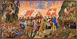 In the early 17th century, the aristocratic governors of the districts in the Upper Valais pressured the prince-bishop of Sion to abdicate secular power, which was achieved temporarily in 1613 and then permanently in 1634, when the country became the federal Republic of the Seven Tithings under the rule of a Landeshauptmann.[8] The republic in its original form existed until 1798, when the districts of the Lower Valais, until then ruled as subjects, successfully revolted against the Seven Tithings and achieved equal status within the republic.[9] During the French invasion of the Swiss Confederacy in the same year, Valais was incorporated into the Helvetic Republic until 1802 when it became the separate Rhodanic Republic.