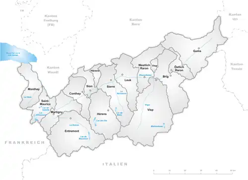 Valais is divided into 13 districts, with the district of Raron being further divided into two half-districts. The districts are listed here in geographical order: