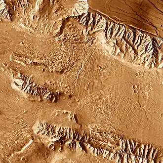 Further to the east from Oudemans, Ius and Tithonium chasmata are located parallel to each other, Ius to the south and Tithonium to the north. Ius is the wider of the two, leading to Melas Chasma. Ius has a ridge down the center of it by the name of Geryon Montes, composed of the undivided basement rock. The floor of Ius Chasma is mostly composed of pristine landslide material, not much degraded by cratering or erosion. The southern wall of Ius, and to a lesser extent the northern wall, has many short valleys stretching off roughly perpendicular to the line of the chasmas. These valleys have a stubby theater-headed leading edge very much like features seen on the Colorado Plateau near the Grand Canyon that appear from groundwater sapping. (Theater-headed means that, from above, the head of the valley is a well-defined U-shape). The valley is propagated by the continued erosion and the collapse of the wall.[16] Tithonium Chasma is very similar to Ius, except it is lacking the sapping features on the south side and contains a small portion of material that is similar to the smooth floor features except that it appears to be an ash fall that has been eroded by the wind. Between the two canyons, the surface is composed of younger fractured material - lava flows and faults from crustal extension of the Tharsis Bulge.[12]