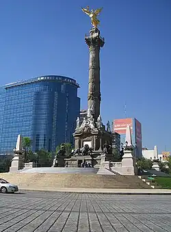It was only when the population reached about six million that Mexico City started to need to appropriate water from outside the valley.[3] Today, Mexico City faces a serious water deficit. Because of increased demand from a growing population, increasing industry, and ecosystem degradation in the form of deforestation of the surrounding mountains, more water is leaving the system than is entering. It is estimated that 63 cubic meters per second (1,000,000 US gal/min) of water is needed to support the potable and agricultural irrigation needs of Mexico City's population.[3] The main aquifer is being pumped at a rate of 55.5 m3/s (880,000 US gal/min), but is only being replaced at 28 m3/s (440,000 US gal/min), or about half of the extraction rate, leaving a shortfall of 27.5 m3/s (436,000 US gal/min).[3] This over-extraction of groundwater from the old clay lake bed has been causing the land upon which the city rests to collapse and sink. This problem began in the early 20th century as a consequence of the drainage of the valley for flood control. Since the beginning of the 20th century, some areas of Mexico City have sunk nine meters (30 feet).[3] In 1900, the bottom of the lake was three meters (9.8 feet) lower than the median level of the city center. By 1974, the lake bottom was two meters (6.6 feet) higher than the city.[8] The first signs of dropping ground water levels was the drying up of natural springs in the 1930s, which coincides with the beginning of intensive exploitation of the aquifer system through wells between 100 and 200 meters (330 and 660 ft) deep.[8] Today, Mexico City is sinking between five and forty centimeters (0.2 and 1.3 ft) per year, and its effects are visible.[3] El Ángel de la Independencia ("The Angel of Independence") statue, located on Paseo de la Reforma was built in 1910, anchored by a foundation deep beneath what was the surface of the street at that time. However, because the street has sunk around it, steps have been added to allow access to the statue's base.[3]
