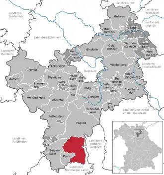 Its name is derived from Veldenstein Castle, a large, well preserved, medieval fortification above Neuhaus an der Pegnitz. The Veldenstein Forest, with its extensive pine and spruce woods has an area of around 70 km2 and is one of the largest contiguous areas of forest in Bavaria. A large part of the Veldenstein Forest lies on the territory of the district of Bayreuth and forms the fourth largest unincorporated area in Bavaria (55.60 km2).