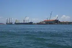 The major products produced on Labuan and exported through Labuan Port include copra, rubber and sago.[16] The port is on a natural deep-water bay where large vessels can anchor as it is sheltered from typhoons. Vessels received include containers, bulk, and general cargoes. The main jetty is 244 metres long with an alongside depth of 8.5 metres and it can accommodate vessels to 16,000 DWT. The wharf has four berths. There are about 15,600 m² available in open storage, two warehouses and a container yard. A 10,000 m² yard and warehouses are available outside the port. Its capacity is 100,000 TEUs of containerised cargo per annum. Five private jetties are installed: the Shell Jetty that specialises in petroleum; the Iron Ore Jetty; the Methanol Jetty; and two offshore wheat and maize jetties called the Asian Supply Base Jetty and the Sabah Flour Mill Jetty.[16]