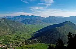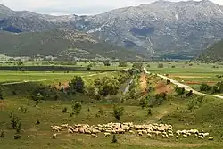 The photo with the sheep shows the main part of the basin, where attempts are made to avoid flooding by several ditches and subterranean drainage. However, when there is very much winter rain, floods are possible in spite of two ponors (katavothes) and an artificial tunnel. The flooding then forces the farmers to delay their cultivations.[1] The basin has two extensions to the far northeast.