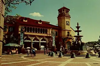 The Porto Europa theme park was created by MCA Planning and Development (P&D), which was Universal Studios' creative arm prior to its renaming as Universal Creative in 1997. The park was built using American specialty vendors and Japanese construction companies, and opened in July 1994. With a footprint of 4.5 acres (1.8 hectares), Porto Europa consists of three themed areas: a French, an Italian and a Spanish town.[9] There are three major attractions, a flume ride/dark ride combination, a motion simulator/film ride, and an indoor stunt show which is now closed, with the theater space empty. The smaller attractions at opening included a jazz club, disco, cinema, laser tag, and virtual reality installation.[10] There are also retail outlets, restaurants, and street shows.[11][12][13]