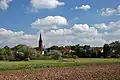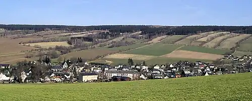 The Waldhufendorf ("forest village"; plural: -dörfer) is a form of rural settlement established in areas of forest clearing with the farms arranged in a series along a road or stream, like beads on a chain.[1] It is typical of the forests of central Germany and is a type of Reihendorf, in which each farmstead usually has two wide strips of land adjacent to the farmhouse.