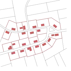 The main axis of the settlement is usually formed by a road, but also often by a stream, on the banks of which may be found common pasture. New settlers were given strips of land alongside tracks or roads, the size of a Hufe, which they proceeded to clear. The farmhouses were erected by a track, almost always outside the flood plain of the stream and farming was practised on the land behind them. At the far end of the Hufe was the forest or its remnants which, in the course of time, could be cleared and turned into additional fields for cultivation or farming.