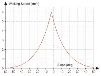 Tobler was an avid hiker, and combined this with his interest in flow and movement to generate "Tobler's hiking function", also known as "Tobler's walking rule".[46][84][85] In this research, Tobler used himself as a subject, and published the results in a 1993 paper.[84] With this function, he sought to model and predict an average hiker's walking speed on various slopes.[84] Researchers have suggested this function has various real-world applications, including for self-driving cars, route decisions, and wayfinding apps.[84]