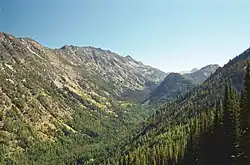 The higher precipitation of the mountains compared with the surrounding country has created a mesic habitat in the Wallowas.[20] Vegetation in the region contains combinations of plants found in both the Rocky Mountains and the Cascades.[21] At low elevations, Douglas fir is the most common tree for slopes, whereas Engelmann spruce and lodgepole pine occur in valley bottoms, with grand fir common below 5,300 feet (1,600 m).[22] In meadows and around springs and seeps, willows and sedge grow.[21] Above 7,000 feet (2,100 m), subalpine fir is dominant, and whitebark pine is often found on ridges and south-facing slopes.[23]