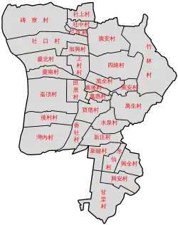 The township comprises 30 villages: Baocuo, Gantang, Guangan, Houcun, Jiaxing, Lunding, Shangcun, Shekou, Shepi, Sheshang, Shezhong, Shuiquan, Shuixian, Siwei, Tiancuo, Wanan, Wanhou, Wanhui, Wannei, Wanquan, Wansheng, Xiabei, Xianan, Xiangshe, Xingan, Xingquan, Xinzhong, Xinzhuang, Zhuanliao and Zhulin.