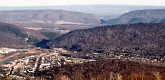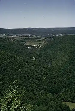A water gap is a gap that flowing water has carved through a mountain range or mountain ridge and that still carries water today.[1] Such gaps that no longer carry water currents are called wind gaps. Water gaps and wind gaps often offer a practical route for road and rail transport to cross the mountain barrier.