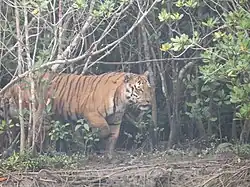 West Bengal is on the eastern bottleneck of India, stretching from the Himalayas in the north to the Bay of Bengal in the south. The state has a total area of 88,752 square kilometres (34,267 sq mi).[3] The Darjeeling Himalayan hill region in the northern extreme of the state is a part of the eastern Himalayas mountain range. In this region is Sandakfu, which, at 3,636 m (11,929 ft), is the highest peak in the state.[91] The narrow Terai region separates the hills from the North Bengal plains, which in turn transitions into the Ganges delta towards the south. The Rarh region intervenes between the Ganges delta in the east and the western plateau and high lands. A small coastal region is in the extreme south, while the Sundarbans mangrove forests form a geographical landmark at the Ganges delta.[92]