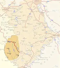 The West Eifel (German: Westeifel) refers to that part of the Eifel mountains in Germany that is centred on the town of Prüm and reaches as far as the border with Belgium and Luxembourg. It is not geographically precisely defined however, overlapping by about 60% with the Schnee Eifel), whilst geologically its northern half is part of the Vulkaneifel and its southern half part of the South Eifel.