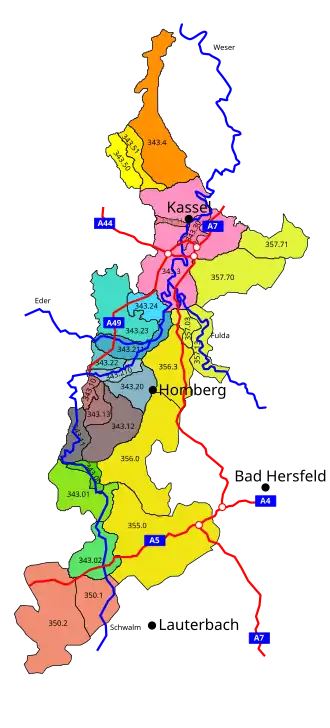 The West Hesse Depression runs along the valleys of the Schwalm, Eder, Fulda, Esse and Diemel roughly from Alsfeld in the south to Bad Karlshafen in the north. It separates the East Hesse Highlands (major regional group 34 or D46), including the Knüll hills and Kaufungen Forest in the east, from the West Hesse Highlands (35 or D47), including the Kellerwald and Habichtswald in the west and is itself part of the West Hesse Highlands, within which it is included as geographical unit 343. Its southern boundary is formed by the northern foothills of the Vogelsberg, which is part of the Hessian Central Uplands within the East Hesse Highlands region.[4]