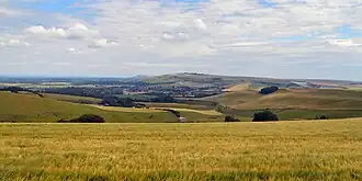 The name Sussex, derived from the Old English 'Sūþseaxe' ('South Saxons'), dates from the Saxon period between AD 477 to 1066, and the history of human habitation in Sussex goes back to the Old Stone Age.[6] The oldest hominin remains known in Britain were found at Eartham Pit, Boxgrove.[7][8] Prehistoric monuments include the Devil's Jumps, a group of Bronze Age burial mounds, and the Iron Age Cissbury Ring and Chanctonbury Ring hill forts on the South Downs.