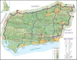 West Sussex is bordered by Hampshire to the west, Surrey to the north and East Sussex to the east. The English Channel lies to the south. The area has been formed from Upper Jurassic and Lower Cretaceous rock strata, part of the Weald–Artois Anticline. The eastern part of this ridge, the Weald of Kent, Sussex and Surrey has been greatly eroded, with the chalk surface removed to expose older Lower Cretaceous rocks of the Wealden Group.[14] In West Sussex the exposed rock becomes older towards the north of the county with Lower Greensand ridges along the border with Surrey including the highest point of the county at Blackdown. Erosion of softer sand and clay strata has hollowed out the basin of the Weald leaving a north facing scarp slope of the chalk which runs east and west across the whole county, broken only by the valleys of the River Arun and River Adur.[15] In addition to these two rivers which drain most of the county a winterbourne, the River Lavant, flows intermittently from springs on the dip slope of the chalk downs north of Chichester.[16] Some intermittent streams are known in the local dialect as "rifes".[17]