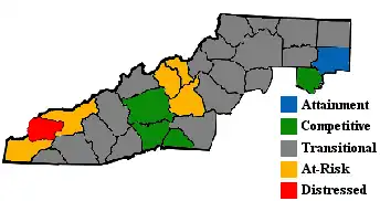 The Appalachian Regional Commission was formed in 1965 to aid economic development in the Appalachian region, which was lagging far behind the rest of the nation on most economic indicators. The Appalachian region, as currently defined by the commission, includes 420 counties in 13 states, including 29 counties in North Carolina. The Commission classifies each county according to five economic qualifications— distressed, at-risk, transitional, competitive, or attainment. "Distressed" counties are considered the most economically endangered and "attainment" counties are the most economically prosperous. The three indicators used for such classification are three-year average unemployment rate, market income per capita, and poverty rate.[7]