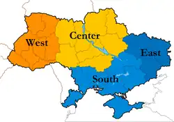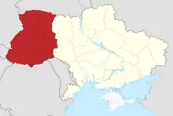 Western Ukraine or West Ukraine (Ukrainian: Західна Україна, romanized: Zakhidna Ukraina, IPA: [ˈzɑxidnɐ ʊkrɐˈjinɐ])[6] refers to the western territories of Ukraine. There is no universally accepted definition of the territory's boundaries, but the contemporary Ukrainian administrative regions (oblasts) of Chernivtsi, Ivano-Frankivsk, Lviv, Ternopil and Zakarpattia (which were part of the former Austro-Hungarian Empire) are typically included. In addition, Volyn and Rivne oblasts (parts of the territory annexed from the Polish–Lithuanian Commonwealth during its Third Partition) are also usually included. In modern sources, Khmelnytskyi Oblast is often included because of its geographical, linguistic and cultural association with Western Ukraine, although this cannot be confirmed from a historical and political point of view. It includes several historical regions such as Carpathian Ruthenia, Halychyna including Pokuttia (the eastern portion of Eastern Galicia), most of Volhynia, northern Bukovina and the Hertsa region, and Podolia. Western Ukraine is sometimes considered to include areas of eastern Volhynia, Podolia, and the small northern portion of Bessarabia.