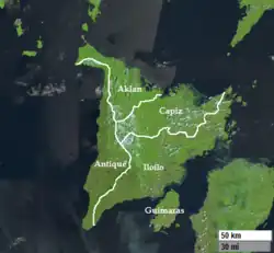 The region is bordered to the north by the Sibuyan Sea, northeast by the Visayan Sea, southeast by the island of Negros, south by the Iloilo Strait and Panay Gulf, and west by the Sulu Sea.