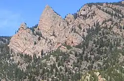 The Wet Mountains are the east flank of an uplifted faulted anticline. The core of the range consists of Precambrian granitic rocks with Paleozoic and Mesozoic strata in fault contact around the southern end and in the northwest.[3] The range lies on the southeast end of the Central Colorado volcanic field and contains Eocene to Oligocene (38–29 Ma) volcanic rocks and carbonatites.[4]
