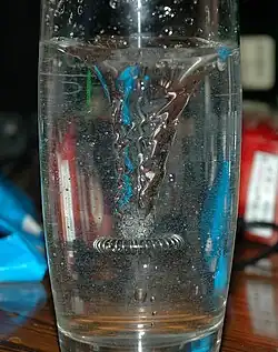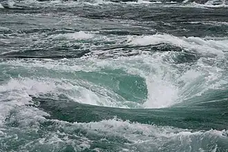 A whirlpool is a body of rotating water produced by opposing currents or a current running into an obstacle.[1] Small whirlpools form when a bath or a sink is draining. More powerful ones formed in seas or oceans may be called maelstroms (/ˈmeɪlstrɒm, -rəm/ MAYL-strom, -strəm). Vortex is the proper term for a whirlpool that has a downdraft.[2]