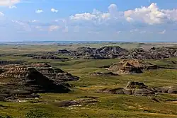 The south-eastern part of the Wood Mountain Hills was one of the few places in Canada that wasn't covered in ice during the Last Glacial Period. This preserved tertiary sands and gravels at higher the elevations while other parts of the hills have glacial drift and deep-cut valleys and coulees carved by glacial meltwaters that are separated by flat-topped buttes. The Rock Creek Badlands, also called Killdeer Badlands,[4] were formed by these melting glaciers. The badlands run along the southern slopes of the plateau.
