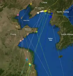 Migration paths and resting grounds of bar-tailed godwit at the Yellow Sea.[13]