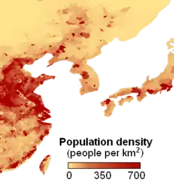 A map of population density around the Yellow Sea in East Asia (1994)[36]