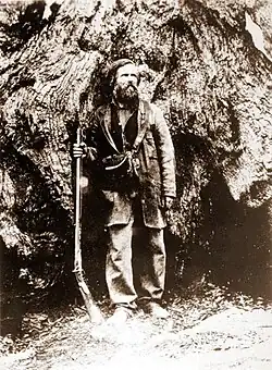 The first non-Native Americans to see Yosemite Valley were probably members of the 1833 Joseph Walker Party, which was the first to cross the Sierra Nevada from east to west.[14] The first descriptions of Yosemite, however, came nearly 20 years later. The 1849 California Gold Rush led to conflicts between miners and Native Americans,[15] and the state formed the volunteer Mariposa Battalion as a punitive expedition against the Native Americans living in the Yosemite area. In 1851, the Battalion was led by Major Jim Savage, whose trading post on the Merced River the Awaneechee had raided.[16] This and other missions (the Mariposa Wars) resulted in Chief Teneiya and the Awaneechee spending months on a reservation in the San Joaquin Valley. The band returned the next year to the Valley but took refuge among the Mono Paiutes after further conflicts with miners. Most of the Awaneechee (along with Teneiya) were chased back to the Valley and killed by the Paiutes after violating hospitality by stealing horses.