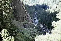 Tenaya Creek flows southwest from Tenaya Lake and down Tenaya Canyon, finally flowing between Half Dome and North Dome before joining the Merced River. The following falls tumble from the Valley rim to join it at various points: