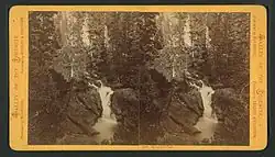 James Hutchings—who organized the first tourist party to the Valley in 1855—and artist Thomas Ayers generated much of the earliest publicity about Yosemite, creating articles and entire magazine issues about the Valley.[20] Ayres' highly detailed angularly exaggerated artwork and his written accounts were distributed nationally and an art exhibition of his drawings was held in New York City.