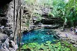 The peninsula is the exposed portion of the larger Yucatán Platform, all of which is composed of carbonate and soluble rocks, being mostly limestone although dolomite and evaporites are also present at various depths. The whole of the Yucatán Peninsula is an unconfined flat lying karst landscape.[7] Sinkholes, known locally as cenotes, are widespread in the northern lowlands.