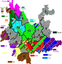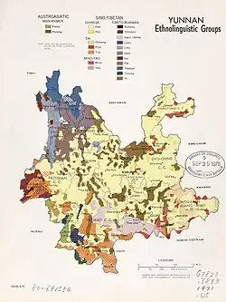 From the Yuan dynasty onward, the area was part of a central-government sponsored population movement towards the southwestern frontier, with two major waves of migrants arriving from Han-majority areas in northern and southeast China.[9] As with other parts of China's southwest, Japanese occupation in the north during World War II forced another migration of Han people into the region. These two waves of migration contributed to Yunnan being one of the most ethnically diverse provinces of China, with ethnic minorities accounting for about 34 percent of its total population.[10] Major ethnic groups include Yi, Bai, Hani, Zhuang, Dai, and Miao.[11] Yunnan has also been identified as the birthplace of tea,[12] and as the region of origin of the plant genus Cannabis.[13]