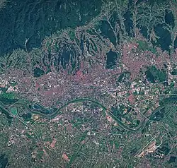 The oldest settlement in the vicinity of the city was the Roman Andautonia, in today's Šćitarjevo.[12] The historical record of the name "Zagreb" dates from 1134, in reference to the foundation of the settlement at Kaptol in 1094. Zagreb became a free royal city in 1242.[13] In 1851, Janko Kamauf became Zagreb's first mayor.[14] Zagreb has special status as a Croatian administrative division—it comprises a consolidated city-county (but separate from Zagreb County),[15] and is administratively subdivided into 17 city districts.[16] Most of the city districts lie at a low elevation along the valley of the river Sava, whereas northern and northeastern city districts, such as Podsljeme[17] and Sesvete[18] districts are spread out across the foothills of the Medvednica mountain,[19] making the city's geographical image rather diverse. The city spans about 30 km from east to west, while stretching about 20 km from north to south.[20][21] Zagreb ranks as a global city, with a 'Beta-' rating from the Globalization and World Cities Research Network.[22]