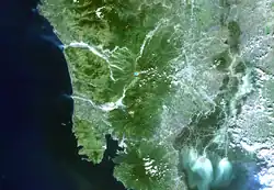 The Zambales Mountains has an area of 300 square kilometres (120 sq mi)[1] extending North to South from the mountains of western Pangasinan province, the whole length of Zambales, to tip of the Bataan Peninsula in the south enclosing Manila Bay.[2] The mountain range also encompasses the mountains in the municipalities of Bamban, Capas, San Jose, San Clemente, Mayantoc, Santa Ignacia, Camiling in the province of Tarlac. In Pampanga, it includes the mountains in Floridablanca, Porac, Angeles City and Mabalacat.