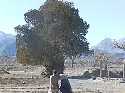 The Cypress of Zibad (Persian: سرو زیبد Sarv-e Zibad), is a Cupressus sempervirens tree in Zibad, Sarv-e Zibad is 10 km (6.2 mi) from [4] Qanats of Ghasabeh a UNESCO's World Heritage Sites since 2016.[13] Sarv-e Zibad is protected by the Cultural Heritage Organization of Iran as a national natural monument and is a major tourist attraction with a height of 20 metres and with a perimeter of 6.5 meters (21 ft) at its trunk and 16 meters (52 ft) higher up around its branches. It is estimated to be over two millennia old and is likely the second-oldest living lifeform in Iran. The exact age of the tree has been difficult to determine, but it is estimated to be between around 2000 years old. Despite the desert and dry place with little rain natural conditions of its location have been credited as the main reason for the tree's longevity.[5].[14] (Persian: سرو زیبد) Sarv Zibad is 1 km (0.62 mi) from Davazdah Rokh battle field near to the Kūh-Zibad and Zibad Castle it was center of ancient Zibad and now located north of the central roundabout of Zibad.